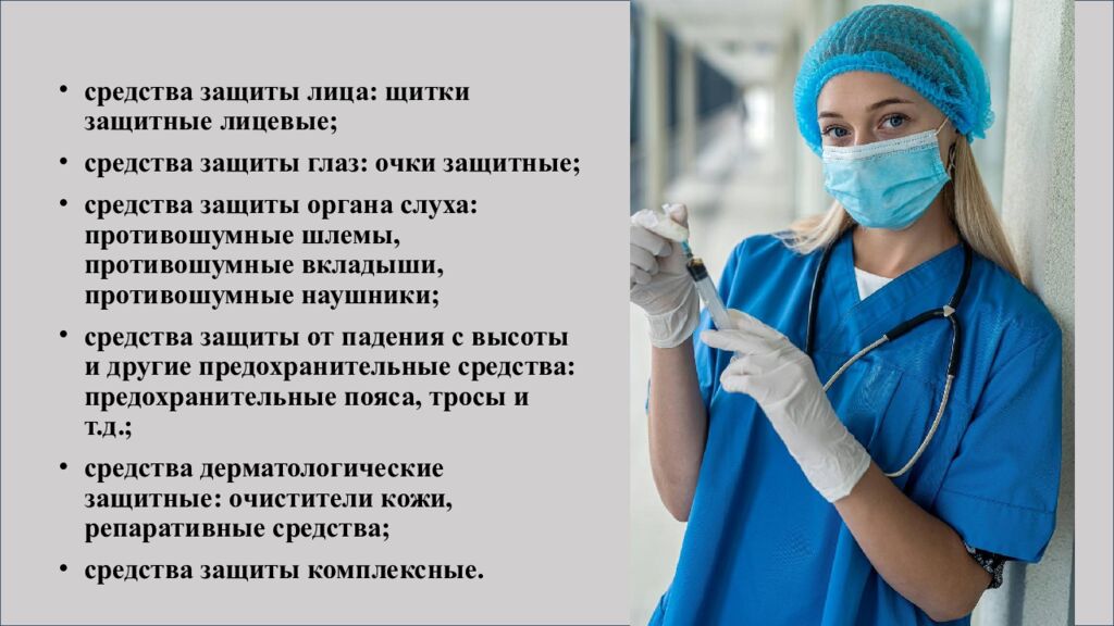 средства защиты лица: щитки защитные лицевые; средства защиты глаз: очки защитные; средства защиты органа слуха: противошумные шлемы, противошумные вкладыши, противошумные наушники; средства защиты от падения с высоты и другие предохранительные средства: предохранительные пояса, тросы и т.д.; средства дерматологические защитные: очистители кожи, репаративные средства; средства защиты комплексные.