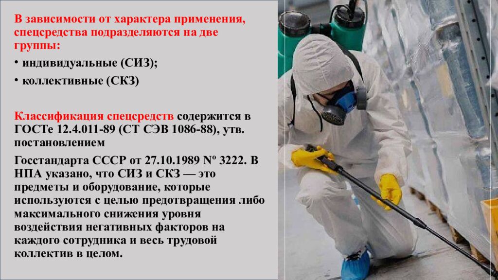 В зависимости от характера применения, спецсредства подразделяются на две группы: индивидуальные (СИЗ); коллективные (СКЗ) Классификация спецсредств содержится в ГОСТе 12.4.011-89 (СТ СЭВ 1086-88), утв. постановлением Госстандарта СССР от 27.10.1989 Nº 3222. В НПА указано, что СИЗ и СКЗ — это предметы и оборудование, которые используются с целью предотвращения либо максимального снижения уровня воздействия негативных факторов на каждого сотрудника и весь трудовой коллектив в целом.