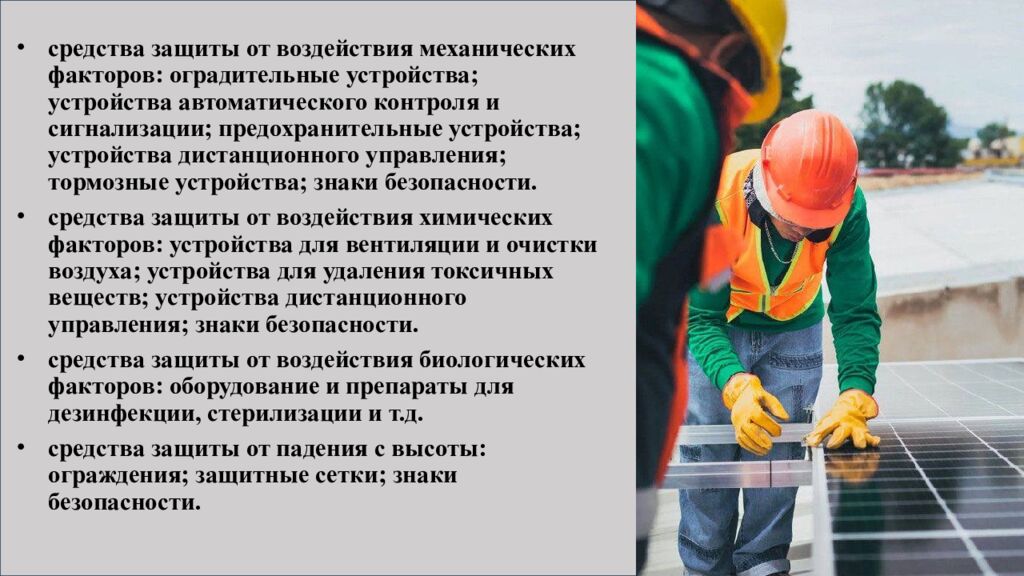 средства защиты от воздействия механических факторов: оградительные устройства; устройства автоматического контроля и сигнализации; предохранительные устройства; устройства дистанционного управления; тормозные устройства; знаки безопасности. средства защиты от воздействия химических факторов: устройства для вентиляции и очистки воздуха; устройства для удаления токсичных веществ; устройства дистанционного управления; знаки безопасности. средства защиты от воздействия биологических факторов: оборудование и препараты для дезинфекции, стерилизации и т.д. средства защиты от падения с высоты: ограждения; защитные сетки; знаки безопасности.
