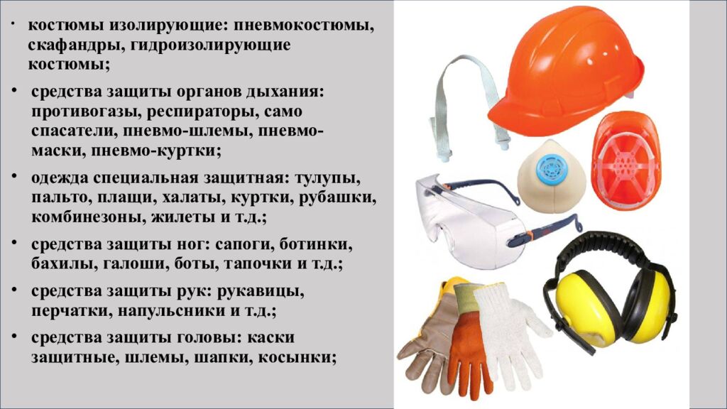 костюмы изолирующие: пневмокостюмы, скафандры, гидроизолирующие костюмы; средства защиты органов дыхания: противогазы, респираторы, само спасатели, пневмо -шлемы, пневмо - маски, пневмо -куртки; одежда специальная защитная: тулупы, пальто, плащи, халаты, куртки, рубашки, комбинезоны, жилеты и т.д.; средства защиты ног: сапоги, ботинки, бахилы, галоши, боты, тапочки и т.д.; средства защиты рук: рукавицы, перчатки, напульсники и т.д.; средства защиты головы: каски защитные, шлемы, шапки, косынки;