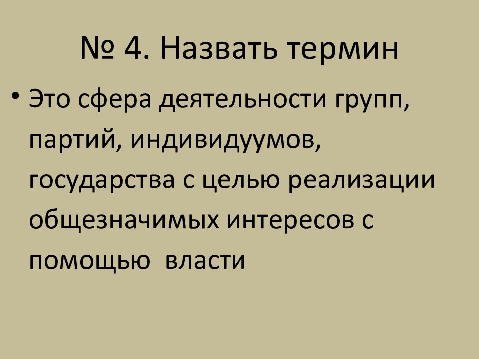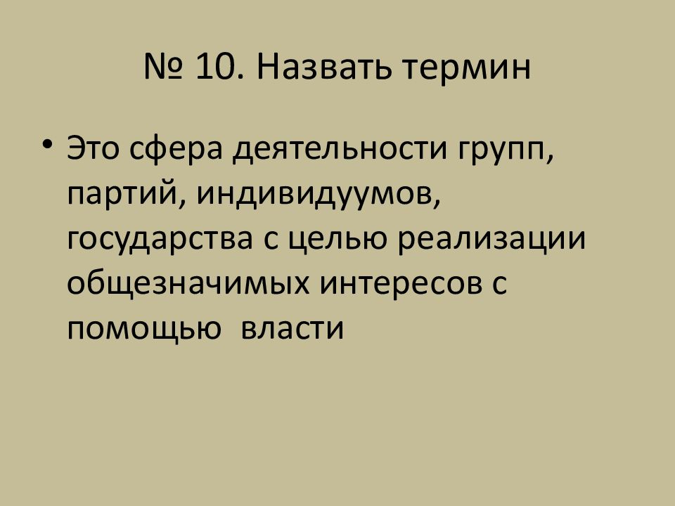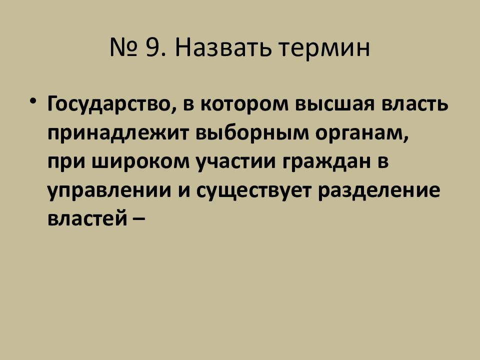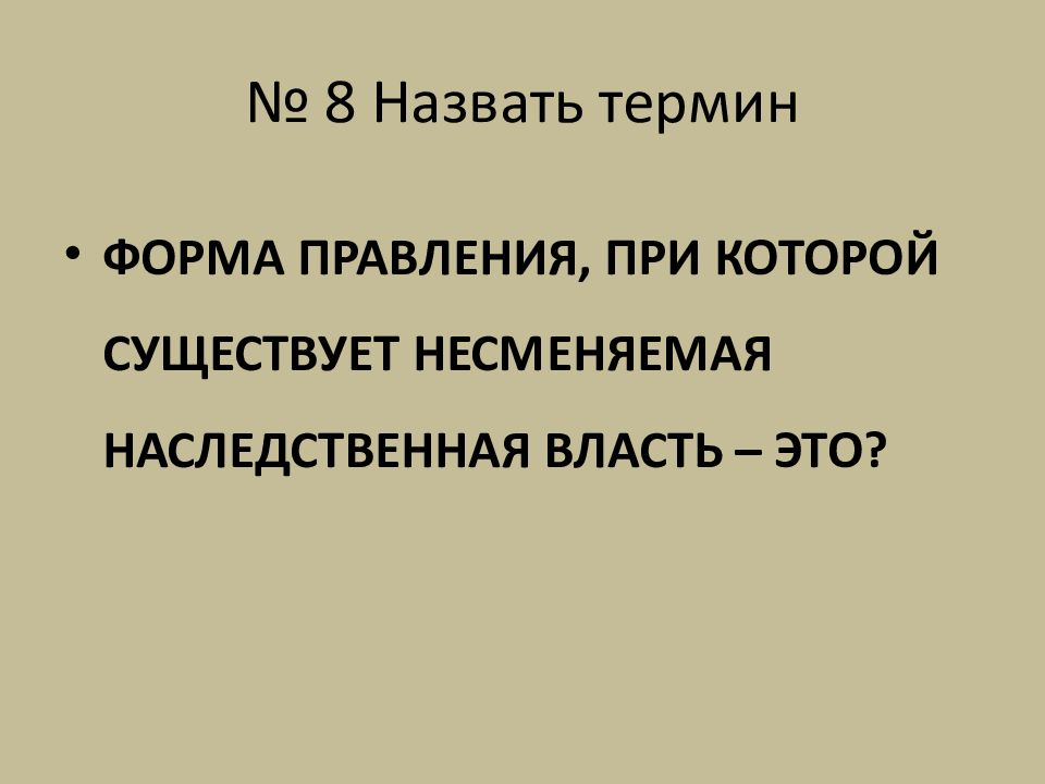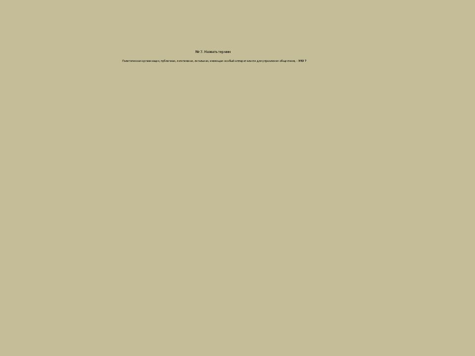 Слайд 8: 7. Назвать термин Политическая организация, публичная, легитимная, легальная, имеющая особый аппарат власти для управления обществом, - ЭТО ?