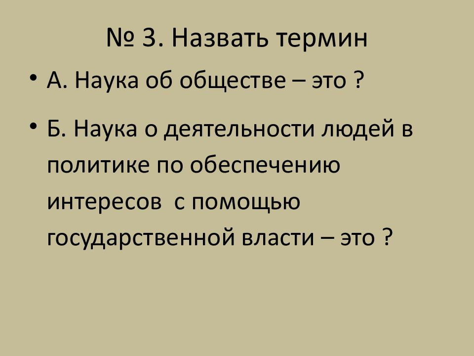 А. Наука об обществе – это ? Б. Наука о деятельности людей в политике по обеспечению интересов с помощью государственной власти – это ?