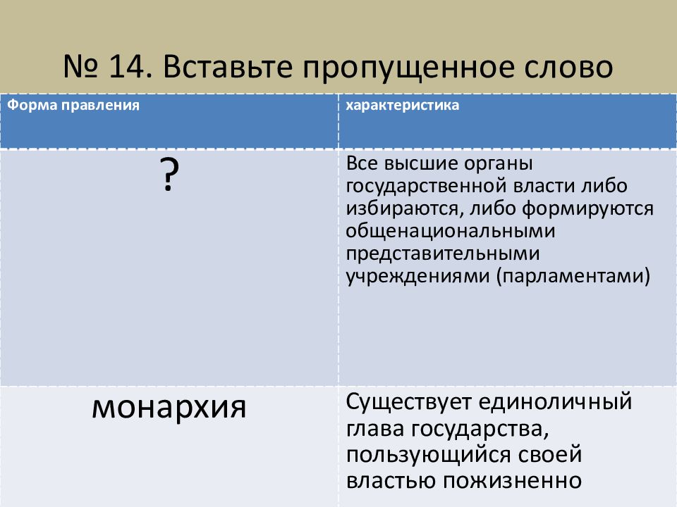 Форма правления характеристика ? Все высшие органы государственной власти либо избираются, либо формируются общенациональными представительными учреждениями (парламентами) монархия Существует единоличный глава государства, пользующийся своей властью пожизненно