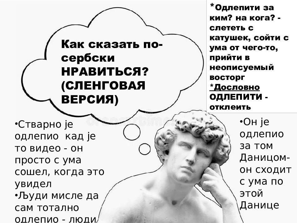 Как сказать по-сербски НРАВИТЬСЯ? (СЛЕНГОВАЯ ВЕРСИЯ) * Одлепити за ким ? на кога ? - слететь с катушек, сойти с ума от чего-то, прийти в неописуемый восторг *Дословно ОДЛЕПИТИ - отклеить Стварно је одлепио кад је то видео - он просто с ума сошел, когда это увидел Људи мисле да сам тотално одлепио - люди думают, что я с дуба рухнул/с ума сошел. Он је одлепио за том Даницом - он сходит с ума по этой Данице