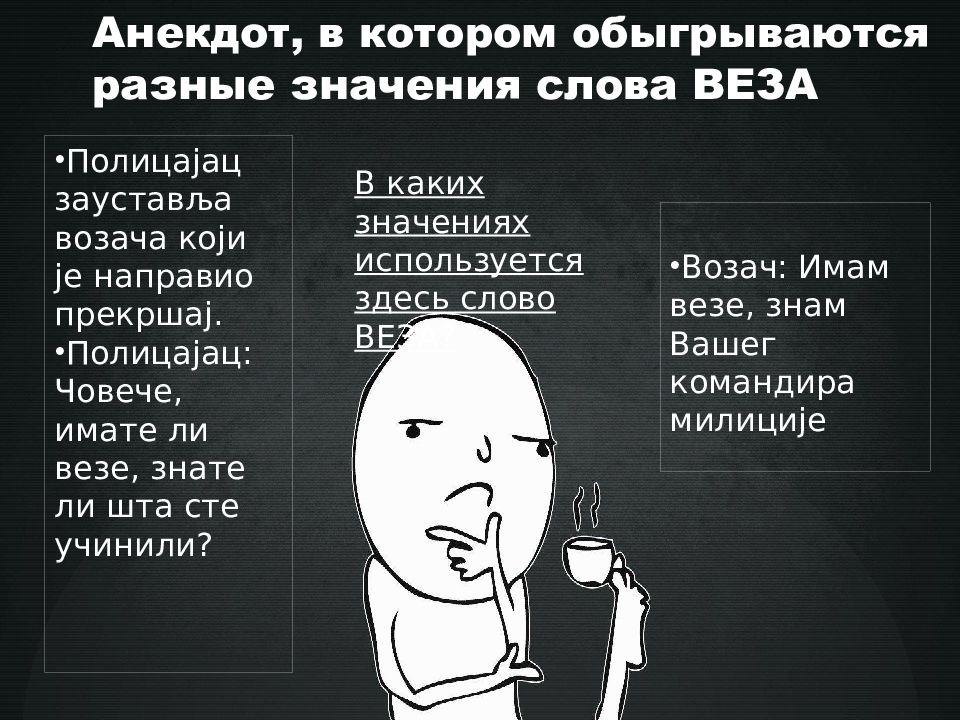 Анекдот, в котором обыгрываются разные значения слова ВЕЗА Полицајац зауставља возача који је направио прекршај. Полицајац : Човече, имате ли везе, знате ли шта сте учинили? Возач : Имам везе, знам Вашег командира милиције В каких значениях используется здесь слово ВЕЗА?