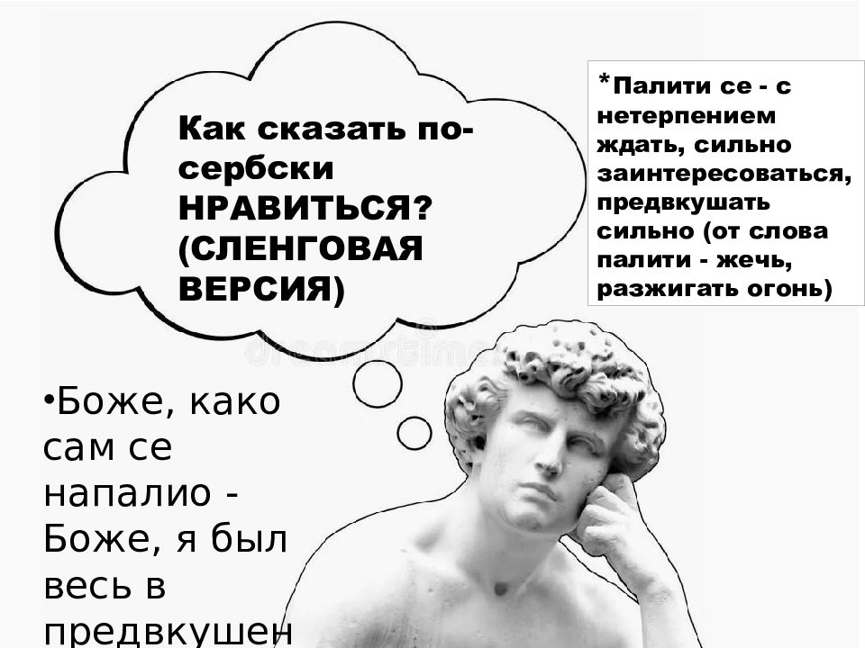 Как сказать по-сербски НРАВИТЬСЯ? (СЛЕНГОВАЯ ВЕРСИЯ) * Палити се - с нетерпением ждать, сильно заинтересоваться, предвкушать сильно (от слова палити - жечь, разжигать огонь) Боже, к ако сам се напалио - Боже, я был весь в предвкушении