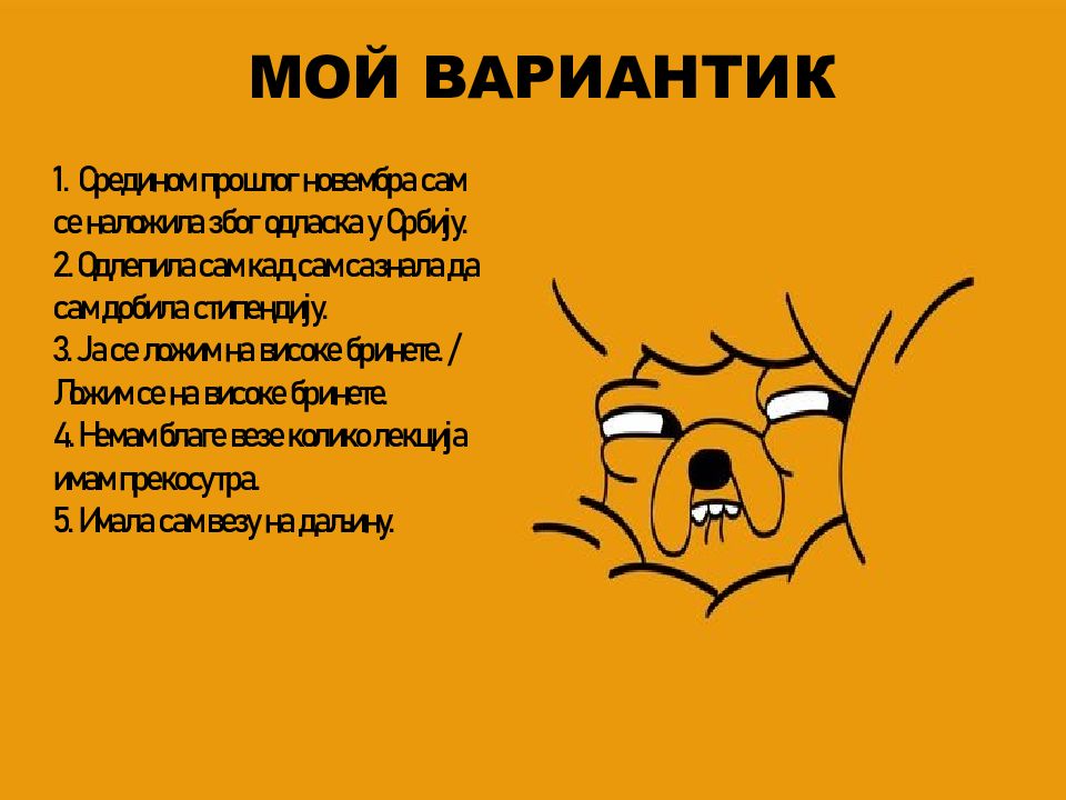 МОЙ ВАРИАНТИК 1. Средином прошлог новембра сам се наложила због одласка у Србију. 2. Одлепила сам кад сам сазнала да сам добила стипендију. 3. Ја се ложим на високе бринете. / Ложим се на високе бринете. 4. Немам благе везе колико лекција имам прекосутра. 5. Имала сам везу на даљину.