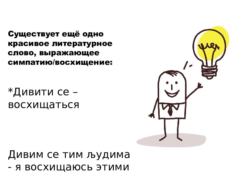 Существует ещё одно красивое литературное слово, выражающее симпатию / восхищение: * Дивити се – восхищаться Дивим се тим људима - я восхищаюсь этими людьми
