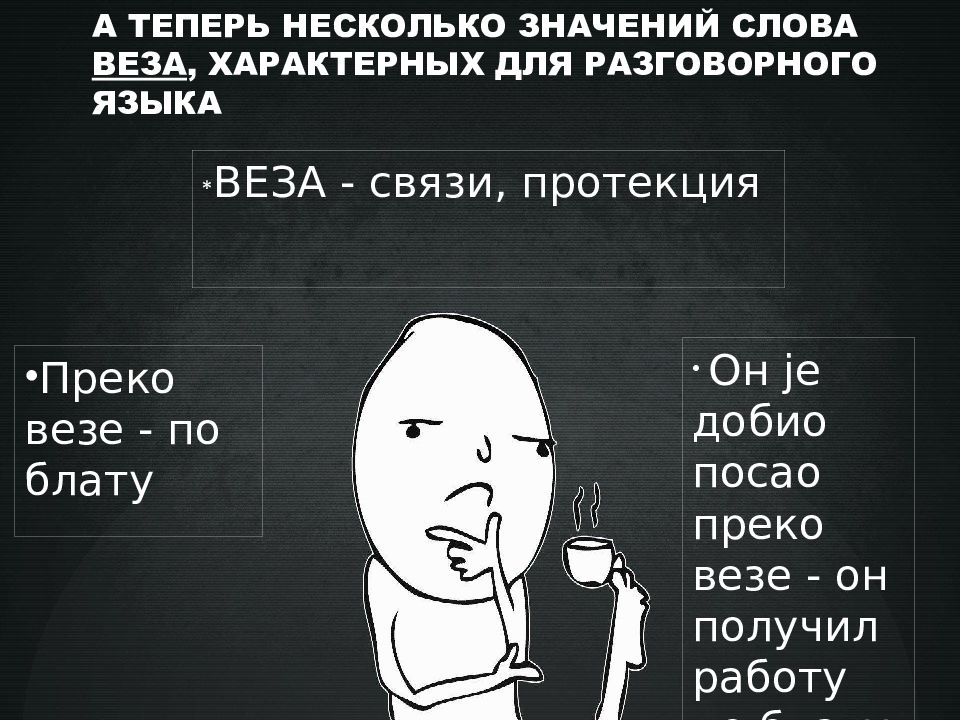 А ТЕПЕРЬ НЕСКОЛЬКО ЗНАЧЕНИЙ СЛОВА ВЕЗА, ХАРАКТЕРНЫХ ДЛЯ РАЗГОВОРНОГО ЯЗЫКА * ВЕЗА - связи, протекция Преко везе - по блату Он је добио посао преко везе - он получил работу по блату