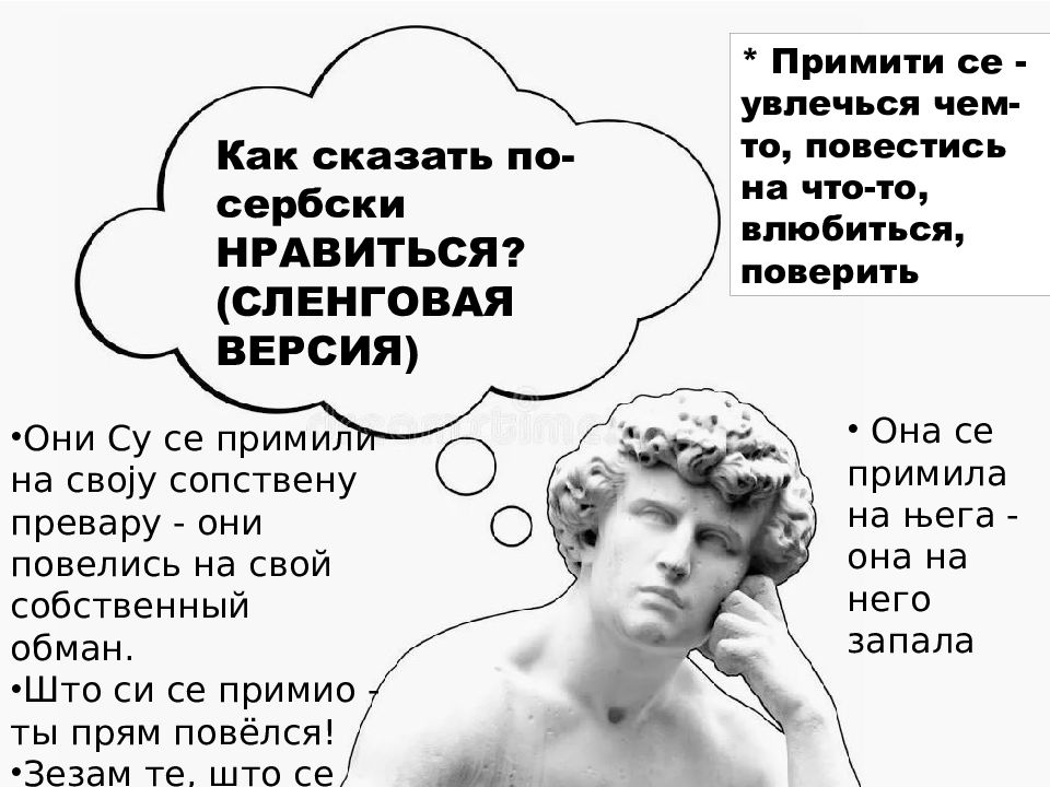 Как сказать по-сербски НРАВИТЬСЯ? (СЛЕНГОВАЯ ВЕРСИЯ) * Примити се - увлечься чем-то, повестись на что-то, влюбиться, поверить Они Су се примили на своjу сопствену превару - они повелись на свой собственный обман. Што си се примио - ты прям повёлся! Зезам те, што се примаш - Я прикалываюсь, что ты ведешься ? Она се примила на њ ега - она на него запала