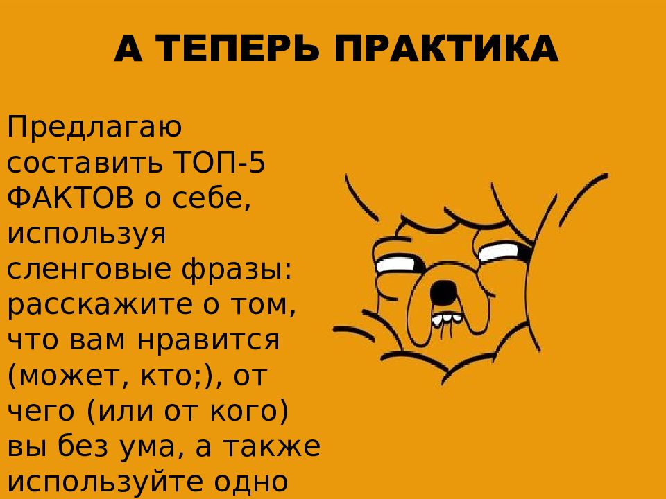 Предлагаю составить ТОП-5 ФАКТОВ о себе, используя сленговые фразы: расскажите о том, что вам нравится (может, кто;), от чего (или от кого) вы без ума, а также используйте одно или несколько значений слова ВЕЗА А ТЕПЕРЬ ПРАКТИКА