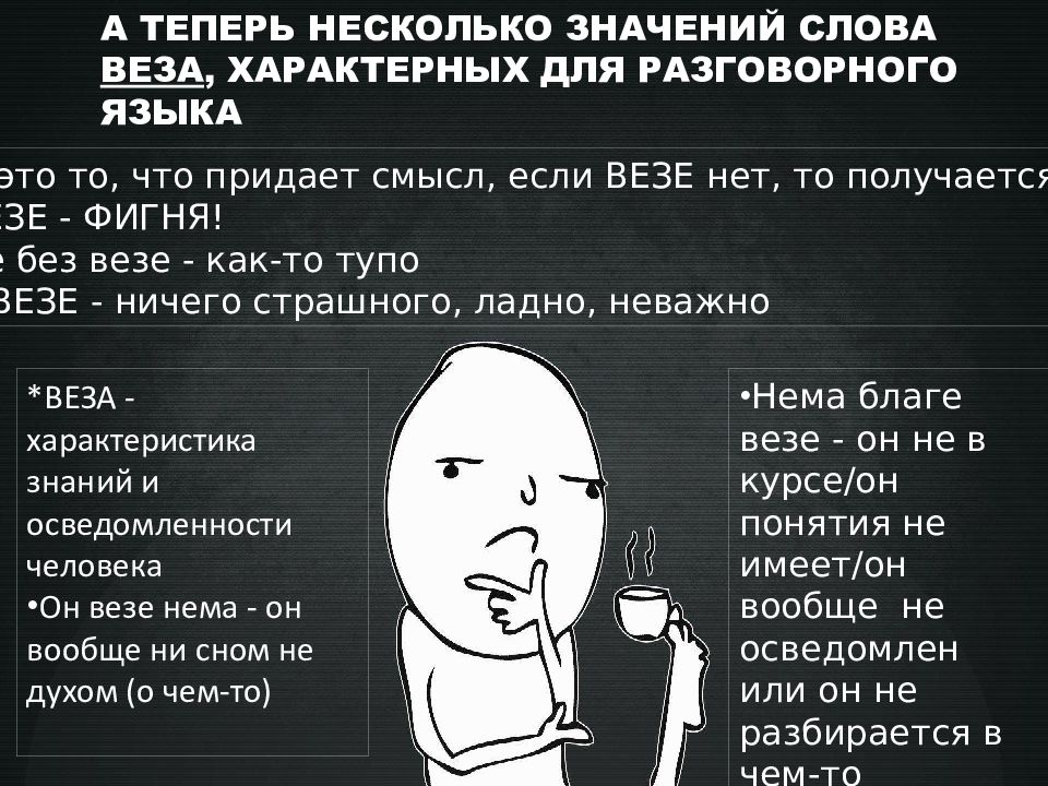 А ТЕПЕРЬ НЕСКОЛЬКО ЗНАЧЕНИЙ СЛОВА ВЕЗА, ХАРАКТЕРНЫХ ДЛЯ РАЗГОВОРНОГО ЯЗЫКА * ВЕЗА - это то, что придает смысл, если ВЕЗЕ нет, то получается фигня : БЕЗ ВЕЗЕ - ФИГНЯ! Мало је без везе - как-то тупо Нема ВЕЗЕ - ничего страшного, ладно, неважно *ВЕЗА - характеристика знаний и осведомленности человека Он везе нема - он вообще ни сном не духом (о чем-то) Нема благе везе - он не в курсе/он понятия не имеет/он вообще не осведомлен или он не разбирается в чем-то