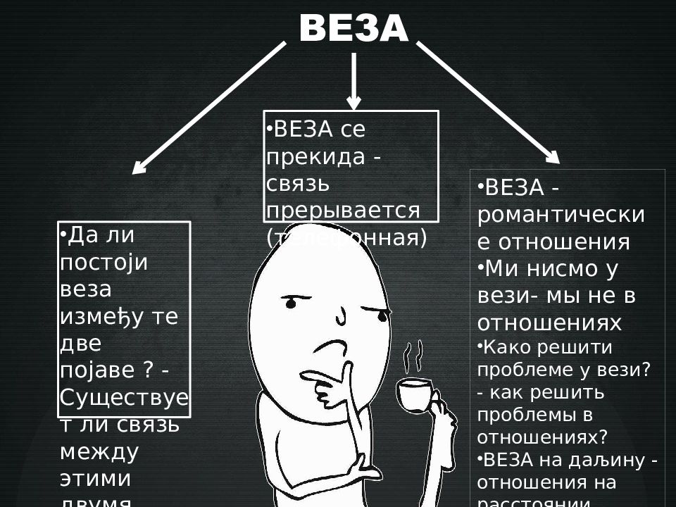 ВЕЗА Да ли постоји веза између те две појаве ? - Существует ли связь между этими двумя явлениями? ВЕЗА се прекида - связь прерывается (телефонная) ВЕЗА - романтические отношения Ми нисмо у вези- мы не в отношениях Како решити проблеме у вези? - как решить проблемы в отношениях? ВЕЗА на даљину - отношения на расстоянии