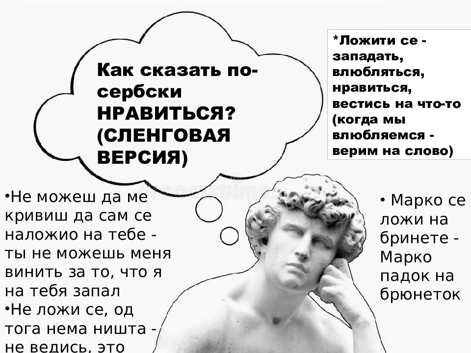 Как сказать по-сербски НРАВИТЬСЯ? (СЛЕНГОВАЯ ВЕРСИЯ) * Ложити се - западать, влюбляться, нравиться, вестись на что-то (когда мы влюбляемся - верим на слово) Не можеш да ме кривиш да сам се наложио на тебе - ты не можешь меня винить за то, что я на тебя запал Не ложи се, од тога нема ништа - не ведись, это пустышка, не верь этому Марко се ложи на бринете - Марко падок на брюнеток