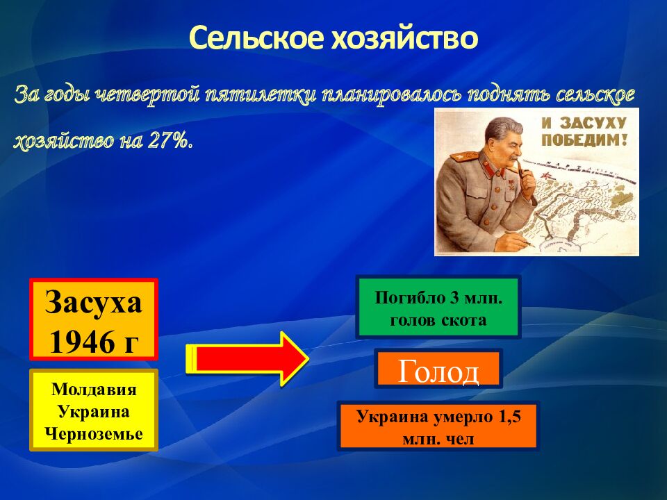 За годы четвертой пятилетки планировалось поднять сельское хозяйство на 27%. Засуха 1946 г Молдавия Украина Черноземье Погибло 3 млн. голов скота Украина умерло 1,5 млн. чел Голод