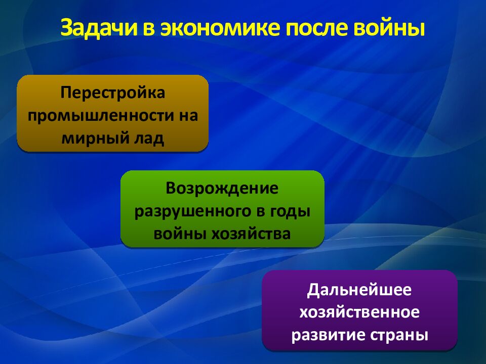 Перестройка промышленности на мирный лад Возрождение разрушенного в годы войны хозяйства Дальнейшее хозяйственное развитие страны
