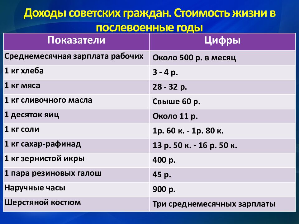 Доходы советских граждан. Стоимость жизни в послевоенные годы Показатели Цифры Среднемесячная зарплата рабочих Около 500 р. в месяц 1 кг хлеба 3 - 4 р. 1 кг мяса 28 - 32 р. 1 кг сливочного масла Свыше 60 р. 1 десяток яиц Около 11 р. 1 кг соли 1р. 60 к. - 1р. 80 к. 1 кг сахар-рафинад 13 р. 50 к. - 16 р. 50 к. 1 кг зернистой икры 400 р. 1 пара резиновых галош 45 р. Наручные часы 900 р. Шерстяной костюм Три среднемесячных зарплаты