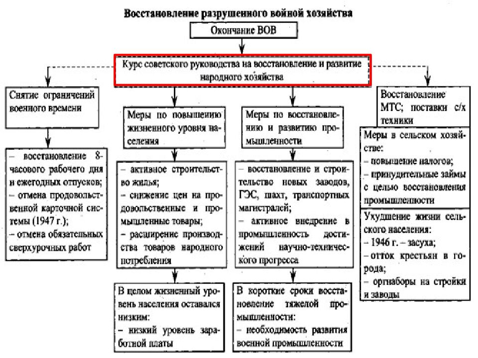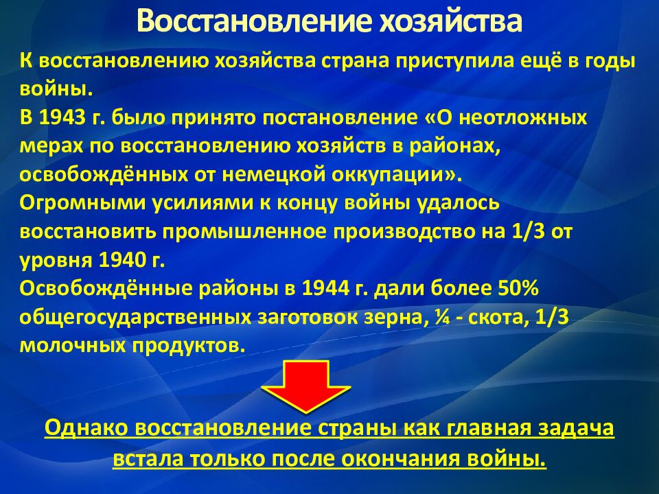 К восстановлению хозяйства страна приступила ещё в годы войны. В 1943 г. было принято постановление «О неотложных мерах по восстановлению хозяйств в районах, освобождённых от немецкой оккупации». Огромными усилиями к концу войны удалось восстановить промышленное производство на 1/3 от уровня 1940 г. Освобождённые районы в 1944 г. дали более 50% общегосударственных заготовок зерна, ¼ - скота, 1/3 молочных продуктов. Однако восстановление страны как главная задача встала только после окончания войны.