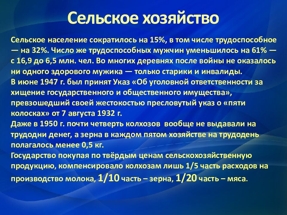 Сельское население сократилось на 15%, в том числе трудоспособное — на 32%. Число же трудоспособных мужчин уменьшилось на 61% — с 16,9 до 6,5 млн. чел. Во многих деревнях после войны не оказалось ни одного здорового мужика — только старики и инвалиды. В июне 1947 г. был принят Указ «Об уголовной ответственности за хищение государственного и общественного имущества», превзошедший своей жестокостью пресловутый указ о «пяти колосках» от 7 августа 1932 г. Даже в 1950 г. почти четверть колхозов вообще не выдавали на трудодни денег, а зерна в каждом пятом хозяйстве на трудодень полагалось менее 0,5 кг. Государство покупая по твёрдым ценам сельскохозяйственную продукцию, компенсировало колхозам лишь 1/5 часть расходов на производство молока, 1/10 часть – зерна, 1/20 часть – мяса.