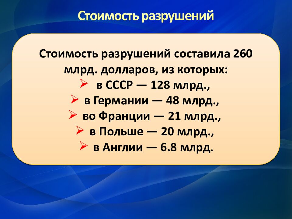 Стоимость разрушений составила 260 млрд. долларов, из которых: в СССР — 128 млрд., в Германии — 48 млрд., во Франции — 21 млрд., в Польше — 20 млрд., в Англии — 6.8 млрд.