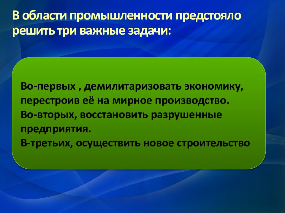 Во - первых, демилитаризовать экономику, перестроив её на мирное производство. Во - вторых, восстановить разрушенные предприятия. В - третьих, осуществить новое строительство