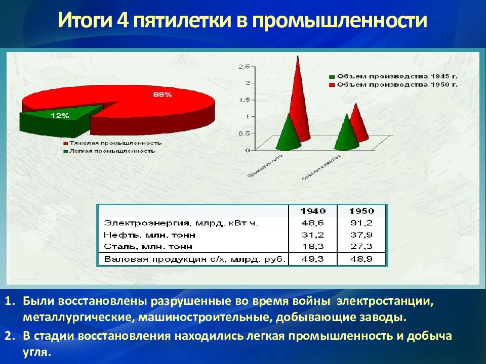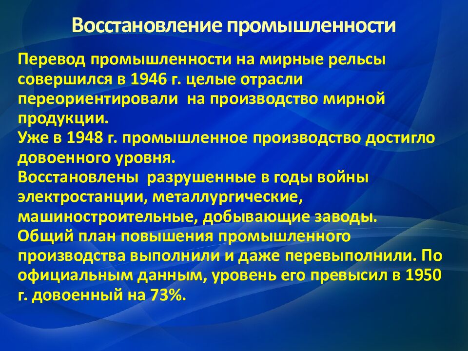 Перевод промышленности на мирные рельсы совершился в 1946 г. целые отрасли переориентировали на производство мирной продукции. Уже в 1948 г. промышленное производство достигло довоенного уровня. Восстановлены разрушенные в годы войны электростанции, металлургические, машиностроительные, добывающие заводы. Общий план повышения промышленного производства выполнили и даже перевыполнили. По официальным данным, уровень его превысил в 1950 г. довоенный на 73%.