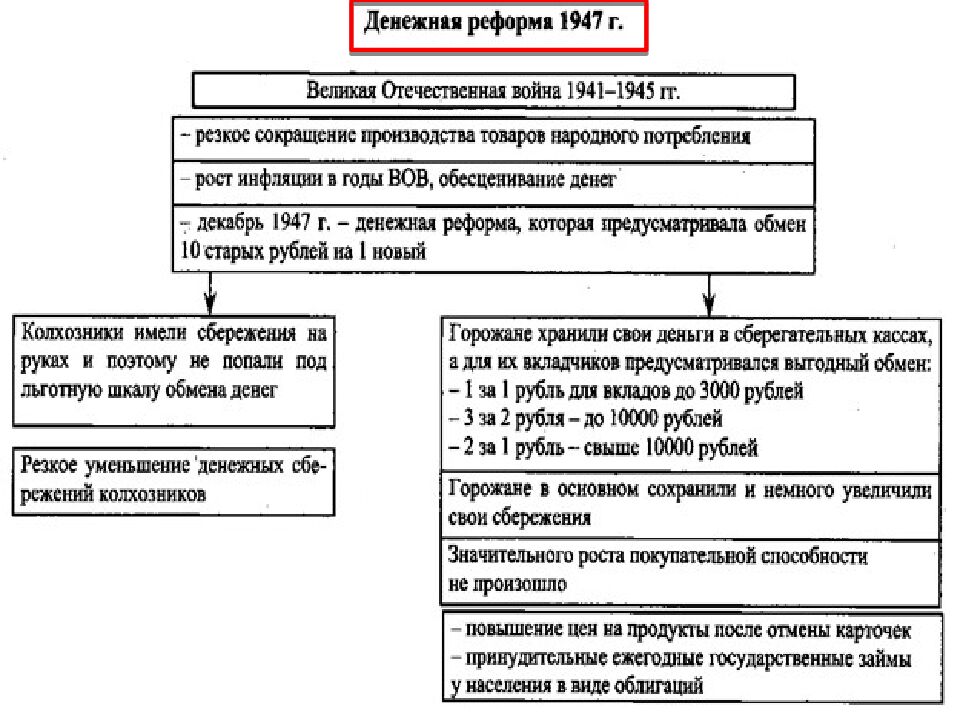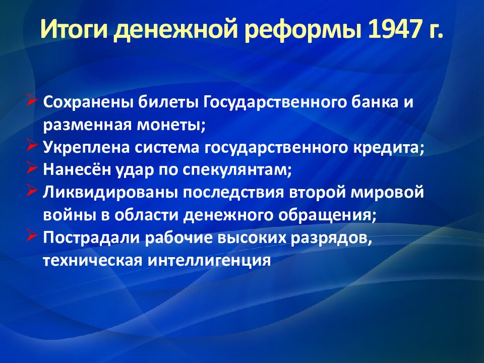 Сохранены билеты Государственного банка и разменная монеты; Укреплена система государственного кредита; Нанесён удар по спекулянтам; Ликвидированы последствия второй мировой войны в области денежного обращения; Пострадали рабочие высоких разрядов, техническая интеллигенция