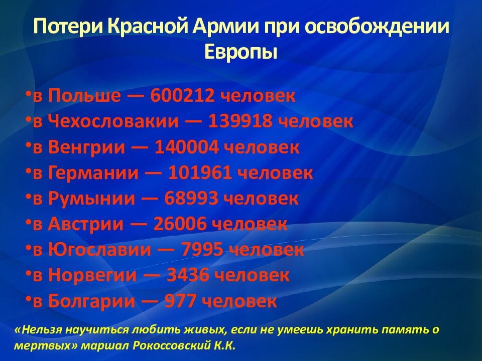 в Польше — 600212 человек в Чехословакии — 139918 человек в Венгрии — 140004 человек в Германии — 101961 человек в Румынии — 68993 человек в Австрии — 26006 человек в Югославии — 7995 человек в Норвегии — 3436 человек в Болгарии — 977 человек «Нельзя научиться любить живых, если не умеешь хранить память о мертвых» маршал Рокоссовский К.К.