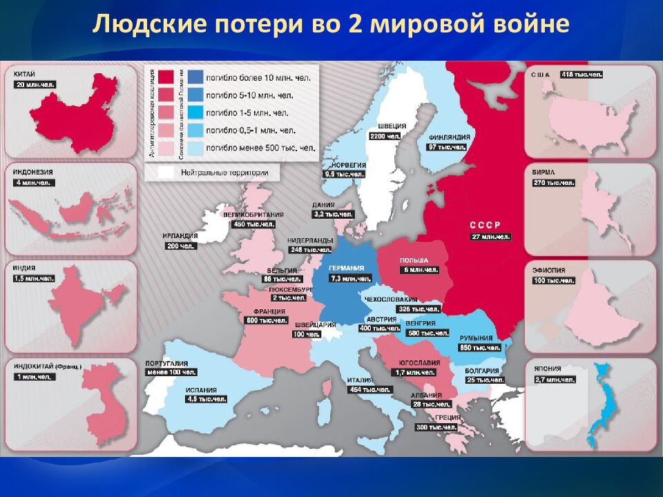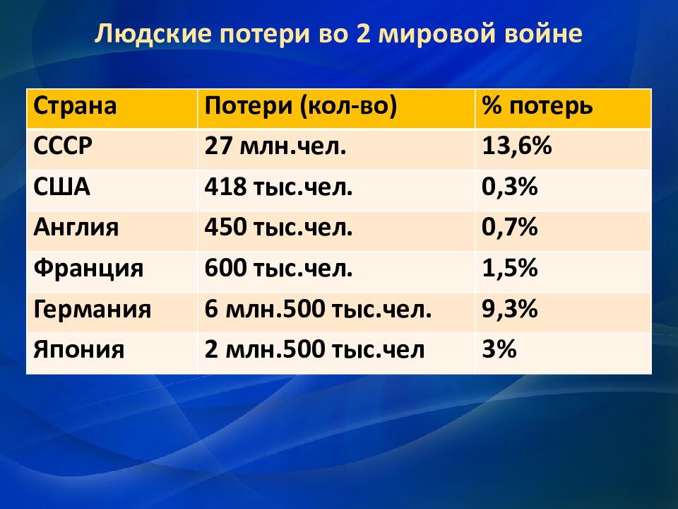 Людские потери во 2 мировой войне Страна Потери (кол-во) % потерь СССР 27 млн.чел. 13,6% США 418 тыс.чел. 0,3% Англия 450 тыс.чел. 0,7% Франция 600 тыс.чел. 1,5% Германия 6 млн.500 тыс.чел. 9,3% Япония 2 млн.500 тыс.чел 3%