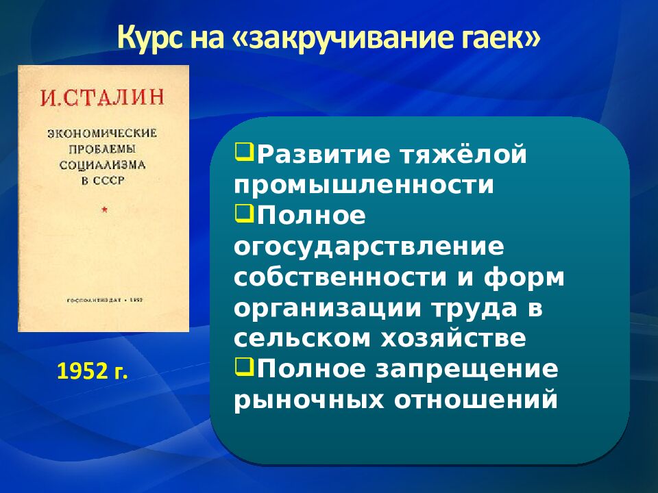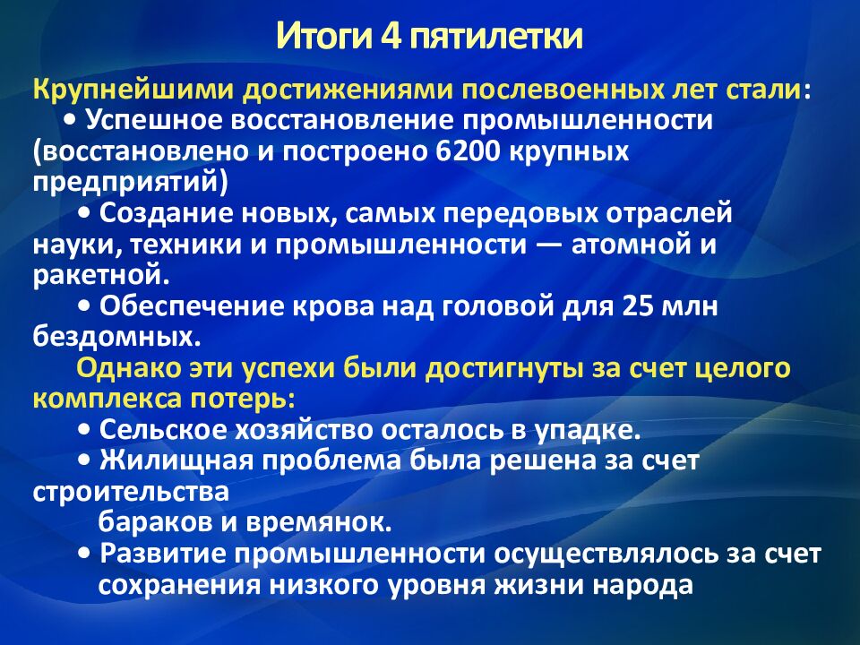 Крупнейшими достижениями послевоенных лет стали : • Успешное восстановление промышленности (восстановлено и построено 6200 крупных предприятий) • Создание новых, самых передовых отраслей науки, техники и промышленности — атомной и ракетной. • Обеспечение крова над головой для 25 млн бездомных. Однако эти успехи были достигнуты за счет целого комплекса потерь: • Сельское хозяйство осталось в упадке. • Жилищная проблема была решена за счет строительства бараков и времянок. • Развитие промышленности осуществлялось за счет сохранения низкого уровня жизни народа
