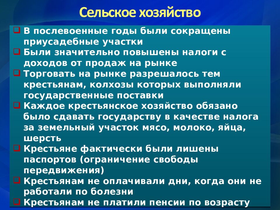В послевоенные годы были сокращены приусадебные участки Были значительно повышены налоги с доходов от продаж на рынке Торговать на рынке разрешалось тем крестьянам, колхозы которых выполняли государственные поставки Каждое крестьянское хозяйство обязано было сдавать государству в качестве налога за земельный участок мясо, молоко, яйца, шерсть Крестьяне фактически были лишены паспортов (ограничение свободы передвижения) Крестьянам не оплачивали дни, когда они не работали по болезни Крестьянам не платили пенсии по возрасту