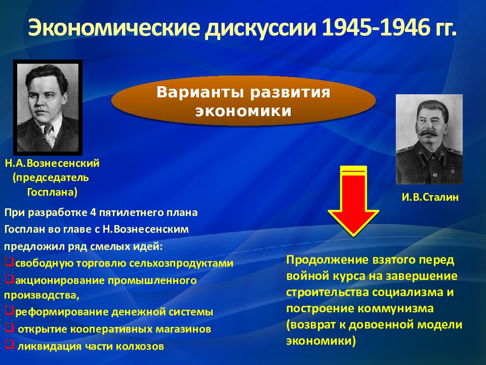 Варианты развития экономики Н.А.Вознесенский (председатель Госплана) И.В.Сталин При разработке 4 пятилетнего плана Госплан во главе с Н.Вознесенским предложил ряд смелых идей: свободную торговлю сельхозпродуктами акционирование промышленного производства, реформирование денежной системы открытие кооперативных магазинов ликвидация части колхозов Продолжение взятого перед войной курса на завершение строительства социализма и построение коммунизма (возврат к довоенной модели экономики)