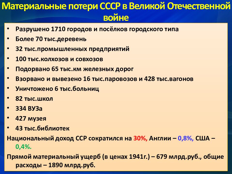 Разрушено 1710 городов и посёлков городского типа Более 70 тыс.деревень 32 тыс.промышленных предприятий 100 тыс.колхозов и совхозов Подорвано 65 тыс.км железных дорог Взорвано и вывезено 16 тыс.паровозов и 428 тыс.вагонов Уничтожено 6 тыс.больниц 82 тыс.школ 334 ВУЗа 427 музея 43 тыс.библиотек Национальный доход ССР сократился на 30%, Англии – 0,8%, США – 0,4%. Прямой материальный ущерб (в ценах 1941г.) – 679 млрд.руб., общие расходы – 1890 млрд.руб.