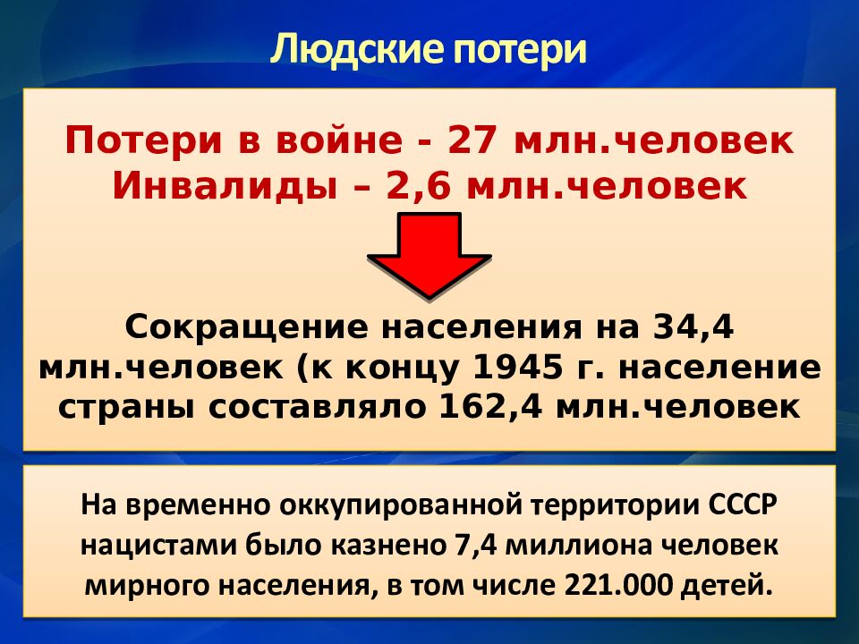 Потери в войне - 27 млн.человек Инвалиды – 2,6 млн.человек Сокращение населения на 34,4 млн.человек (к концу 1945 г. население страны составляло 162,4 млн.человек На временно оккупированной территории СССР нацистами было казнено 7,4 миллиона человек мирного населения, в том числе 221.000 детей.