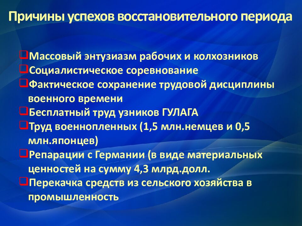 Массовый энтузиазм рабочих и колхозников Социалистическое соревнование Фактическое сохранение трудовой дисциплины военного времени Бесплатный труд узников ГУЛАГА Труд военнопленных (1,5 млн.немцев и 0,5 млн.японцев ) Репарации с Германии (в виде материальных ценностей на сумму 4,3 млрд.долл. Перекачка средств из сельского хозяйства в промышленность
