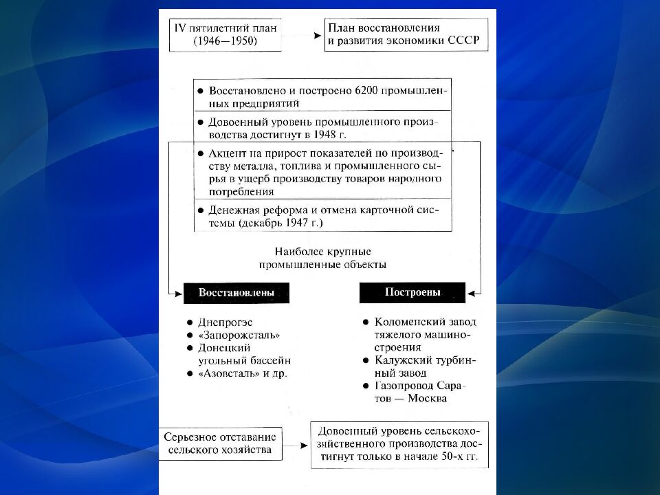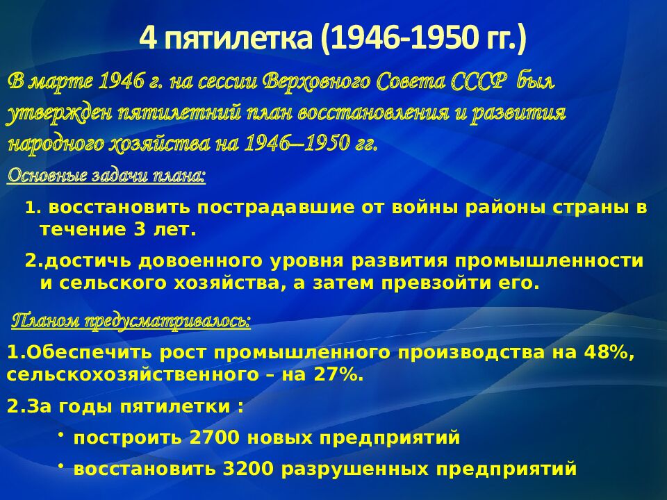 В марте 1946 г. на сессии Верховного Совета СССР был утвержден пятилетний план восстановления и развития народного хозяйства на 1946--1950 гг. Основные задачи плана: восстановить пострадавшие от войны районы страны в течение 3 лет. достичь довоенного уровня развития промышленности и сельского хозяйства, а затем превзойти его. Планом предусматривалось: Обеспечить рост промышленного производства на 48%, сельскохозяйственного – на 27%. За годы пятилетки : построить 2700 новых предприятий восстановить 3200 разрушенных предприятий