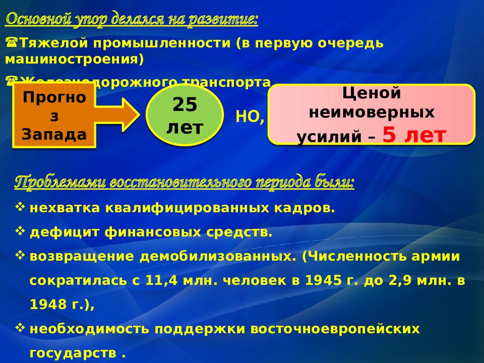 Основной упор делался на развитие: Тяжелой промышленности (в первую очередь машиностроения) Железнодорожного транспорта Прогноз Запада 25 лет НО, Ценой неимоверных усилий – 5 лет Проблемами восстановительного периода были: нехватка квалифицированных кадров. дефицит финансовых средств. возвращение демобилизованных. (Численность армии сократилась с 11,4 млн. человек в 1945 г. до 2,9 млн. в 1948 г.), необходимость поддержки восточноевропейских государств. необходимость скорейшего укрепления обороноспособности страны в условиях начинающейся «холодной войны»