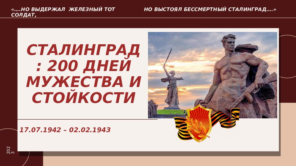 «….НО ВЫДЕРЖАЛ ЖЕЛЕЗНЫЙ ТОТ СОЛДАТ, НО ВЫСТОЯЛ БЕССМЕРТНЫЙ СТАЛИНГРАД….» 202 3 СТАЛИНГРАД: 200 ДНЕЙ МУЖЕСТВА И СТОЙКОСТИ 17.07.1942 – 02.02.1943