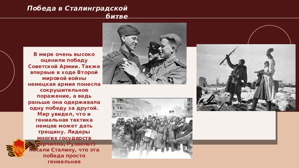 2022 Победа в Сталинградской битве В мире очень высоко оценили победу Советской Армии. Также впервые в ходе Второй мировой войны немецкая армия понесла сокрушительное поражение, а ведь раньше она одерживала одну победу за другой. Мир увидел, что и гениальная тактика немцев может дать трещину. Лидеры многих государств (Черчилль, Рузвельт) писали Сталину, что эта победа просто гениальная