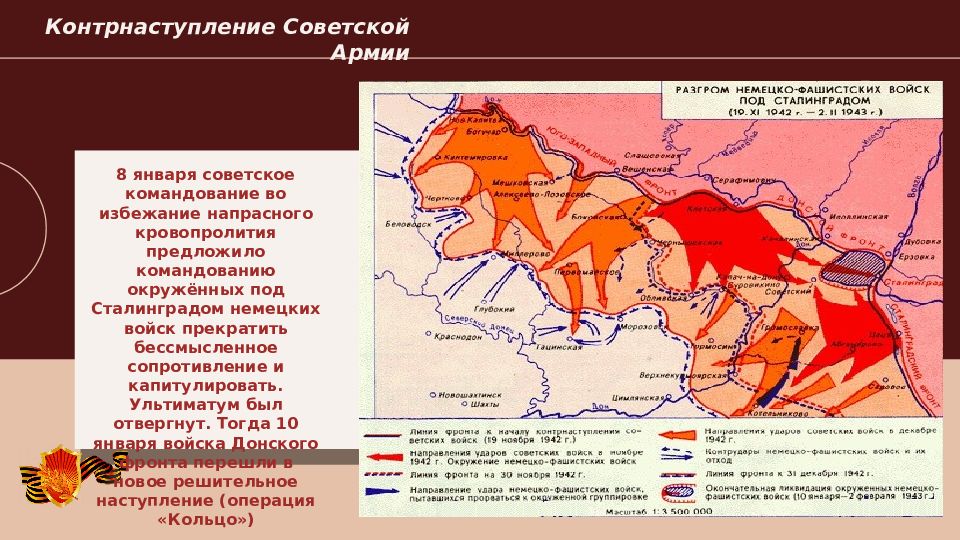 2022 Контрнаступление Советской Армии 8 января советское командование во избежание напрасного кровопролития предложило командованию окружённых под Сталинградом немецких войск прекратить бессмысленное сопротивление и капитулировать. Ультиматум был отвергнут. Тогда 10 января войска Донского фронта перешли в новое решительное наступление (операция «Кольцо»)
