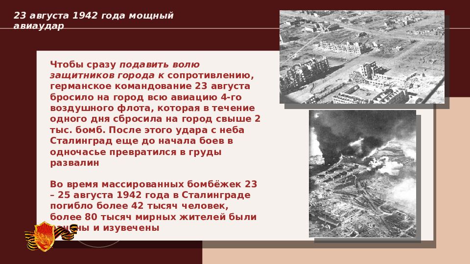 Чтобы сразу подавить волю защитников города к сопротивлению, германское командование 23 августа бросило на город всю авиацию 4-го воздушного флота, которая в течение одного дня сбросила на город свыше 2 тыс. бомб. После этого удара с неба Сталинград еще до начала боев в одночасье превратился в груды развалин Во время массированных бомбёжек 23 – 25 августа 1942 года в Сталинграде погибло более 42 тысяч человек, более 80 тысяч мирных жителей были ранены и изувечены 23 августа 1942 года мощный авиаудар