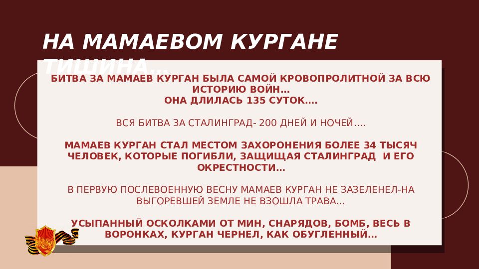 БИТВА ЗА МАМАЕВ КУРГАН БЫЛА САМОЙ КРОВОПРОЛИТНОЙ ЗА ВСЮ ИСТОРИЮ ВОЙН… ОНА ДЛИЛАСЬ 135 СУТОК…. ВСЯ БИТВА ЗА СТАЛИНГРАД- 200 ДНЕЙ И НОЧЕЙ…. МАМАЕВ КУРГАН СТАЛ МЕСТОМ ЗАХОРОНЕНИЯ БОЛЕЕ 34 ТЫСЯЧ ЧЕЛОВЕК, КОТОРЫЕ ПОГИБЛИ, ЗАЩИЩАЯ СТАЛИНГРАД И ЕГО ОКРЕСТНОСТИ… В ПЕРВУЮ ПОСЛЕВОЕННУЮ ВЕСНУ МАМАЕВ КУРГАН НЕ ЗАЗЕЛЕНЕЛ-НА ВЫГОРЕВШЕЙ ЗЕМЛЕ НЕ ВЗОШЛА ТРАВА… УСЫПАННЫЙ ОСКОЛКАМИ ОТ МИН, СНАРЯДОВ, БОМБ, ВЕСЬ В ВОРОНКАХ, КУРГАН ЧЕРНЕЛ, КАК ОБУГЛЕННЫЙ…