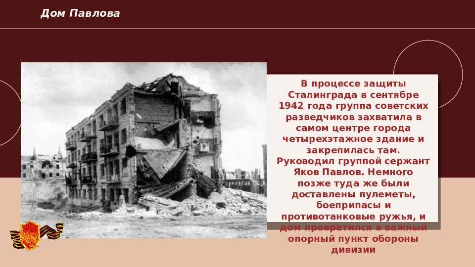 2022 Дом Павлова В процессе защиты Сталинграда в сентябре 1942 года группа советских разведчиков захватила в самом центре города четырехэтажное здание и закрепилась там. Руководил группой сержант Яков Павлов. Немного позже туда же были доставлены пулеметы, боеприпасы и противотанковые ружья, и дом превратился в важный опорный пункт обороны дивизии