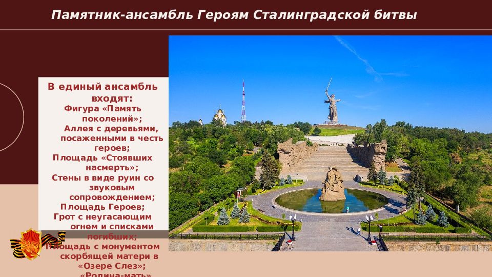 2022 Памятник-ансамбль Героям Сталинградской битвы В единый ансамбль входят: Фигура «Память поколений»; Аллея с деревьями, посаженными в честь героев; Площадь «Стоявших насмерть»; Стены в виде руин со звуковым сопровождением; Площадь Героев; Грот с неугасающим огнем и списками погибших; Площадь с монументом скорбящей матери в «Озере Слез»; «Родина-мать»