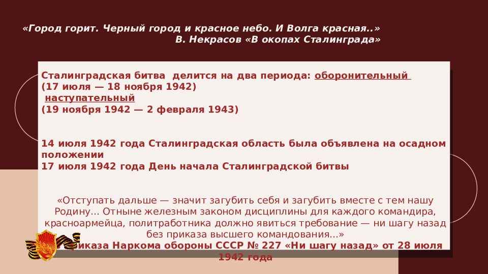 Сталинградская битва делится на два периода: оборонительный (17 июля — 18 ноября 1942) наступательный (19 ноября 1942 — 2 февраля 1943) 14 июля 1942 года Сталинградская область была объявлена на осадном положении 17 июля 1942 года День начала Сталинградской битвы «Отступать дальше — значит загубить себя и загубить вместе с тем нашу Родину… Отныне железным законом дисциплины для каждого командира, красноармейца, политработника должно явиться требование — ни шагу назад без приказа высшего командования...» Из приказа Наркома обороны СССР № 227 «Ни шагу назад» от 28 июля 1942 года