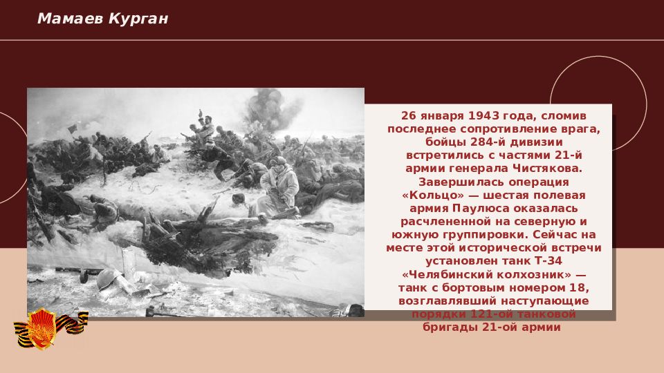 2022 Мамаев Курган 26 января 1943 года, сломив последнее сопротивление врага, бойцы 284-й дивизии встретились с частями 21-й армии генерала Чистякова. Завершилась операция «Кольцо» — шестая полевая армия Паулюса оказалась расчлененной на северную и южную группировки. Сейчас на месте этой исторической встречи установлен танк Т-34 «Челябинский колхозник» — танк с бортовым номером 18, возглавлявший наступающие порядки 121-ой танковой бригады 21-ой армии