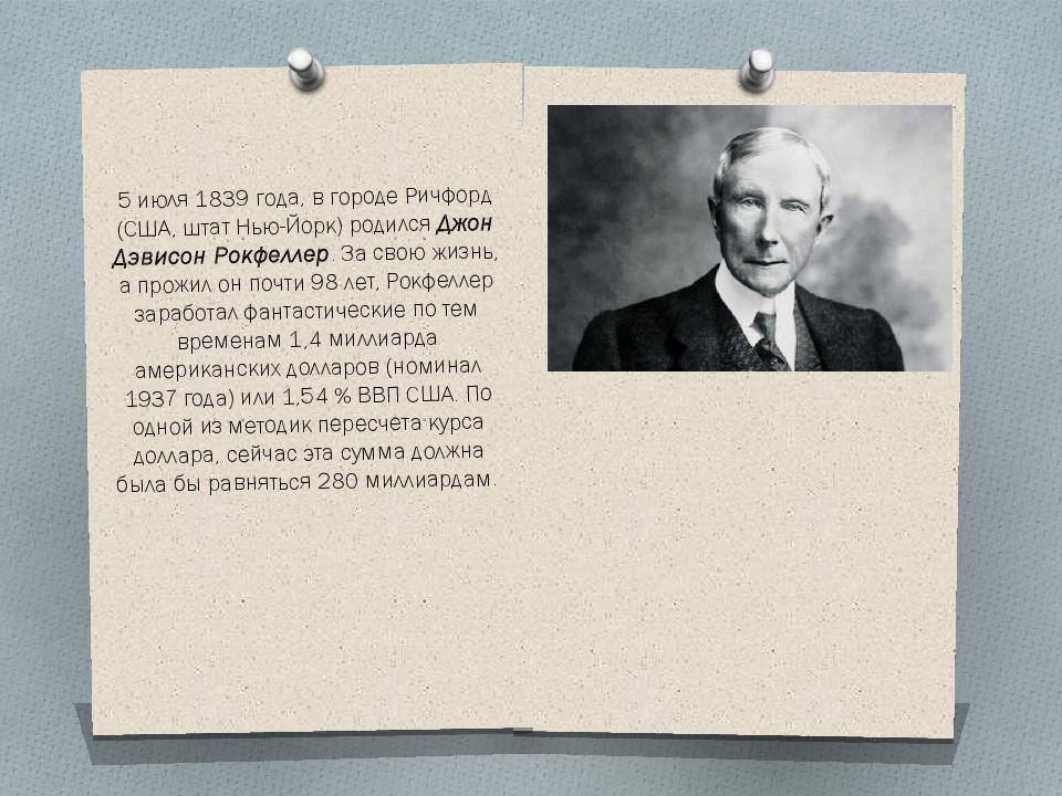 5 июля 1839 года, в городе Ричфорд (США, штат Нью-Йорк) родился Джон Дэвисон Рокфеллер. За свою жизнь, а прожил он почти 98 лет, Рокфеллер заработал фантастические по тем временам 1,4 миллиарда американских долларов (номинал 1937 года) или 1,54 % ВВП США. По одной из методик пересчета курса доллара, сейчас эта сумма должна была бы равняться 280 миллиардам.