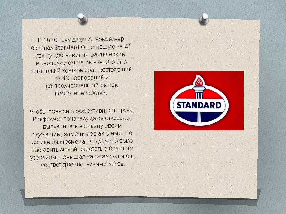 В 1870 году Джон Д. Рокфеллер основал Standard Oil, ставшую за 41 год существования фактическим монополистом на рынке. Это был гигантский конгломерат, состоявший из 40 корпораций и контролировавший рынок нефтепереработки. Чтобы повысить эффективность труда, Рокфеллер поначалу даже отказался выплачивать зарплату своим служащим, заменив ее акциями. По логике бизнесмена, это должно было заставить людей работать с большим усердием, повышая капитализацию и, соответственно, личный доход.