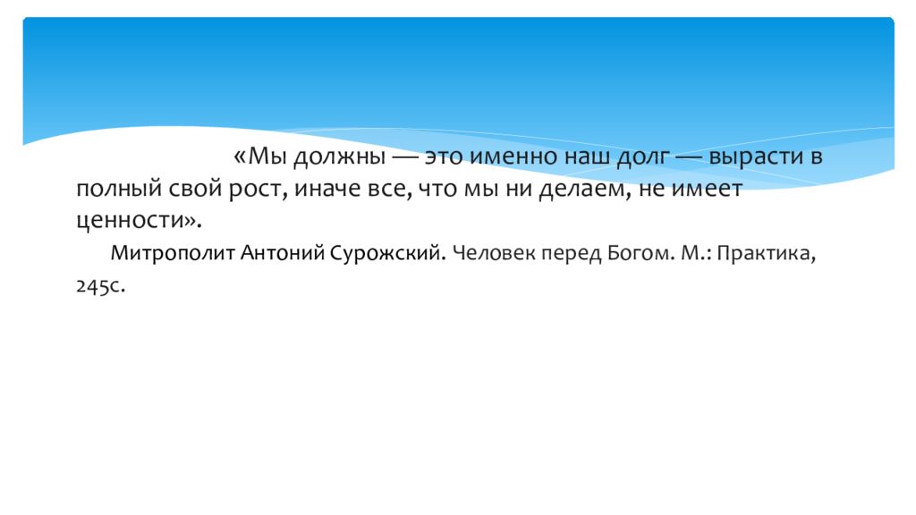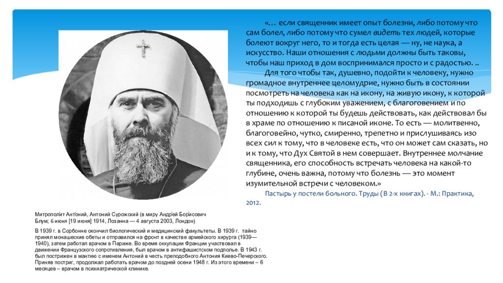 «… если священник имеет опыт болезни, либо потому что сам болел, либо потому что сумел видеть тех людей, которые болеют вокруг него, то и тогда есть целая — ну, не наука, а искусство. Наши отношения с людьми должны быть таковы, чтобы наш приход в дом воспринимался просто и с радостью... Для того чтобы так, душевно, подойти к человеку, нужно громадное внутреннее целомудрие, нужно быть в состоянии посмотреть на человека как на икону, на живую икону, к которой ты подходишь с глубоким уважением, с благоговением и по отношению к которой ты будешь действовать, как действовал бы в храме по отношению к писаной иконе. То есть — молитвенно, благоговейно, чутко, смиренно, трепетно и прислушиваясь изо всех сил к тому, что в человеке есть, что он может сам сказать, но и к тому, что Дух Святой в нем совершает. Внутреннее молчание священника, его способность встречать человека на какой-то глубине, очень важна, потому что болезнь — это момент изумительной встречи с человеком.» Пастырь у постели больного. Труды (В 2-х книгах). - М.: Практика, 2012.