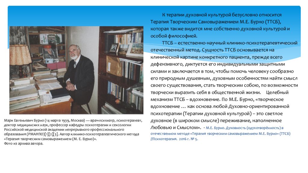 К терапии духовной культурой безусловно относится Терапия Творческим Самовыражением М.Е. Бурно (ТТСБ), которая также видится мне собственно духовной культурой и особой философией. ТТСБ – естественно-научный клинико-психотерапевтический отечественный метод. Сущность ТТСБ основывается на клинической картине конкретного пациента, прежде всего дефензивного, диктуется его индивидуальными защитными силами и заключается в том, чтобы помочь человеку сообразно его природным душевным, духовным особенностям найти смысл своего существования, стать творческим собою, по возможности творчески выразить себя в общественной жизни. Целебный механизм ТТСБ – вдохновение. По М.Е. Бурно, «творческое вдохновение … как основа любой Духовно-ориентированной психотерапии (Терапии духовной культурой) – это светлое духовное (в широком смысле) переживание, наполненное Любовью и Смыслом». - М.Е. Бурно. Духовность (одухотворённость) в отечественном методе «Терапия творческим самовыражением М.Е. Бурно» (ТТСБ) //Психотерапия. 2016 г. № 5. Марк Евгеньевич Бурно (14 марта 1939, Москва) — врач-психиатр, психотерапевт, доктор медицинских наук, профессор кафедры психотерапии и сексологии Российской медицинской академии непрерывного профессионального образования (РМАНПО)[1][2][3]. Автор клинико-психотерапевтического метода «Терапия творческим самовыражением (М. Е. Бурно )». Фото из архива автора.